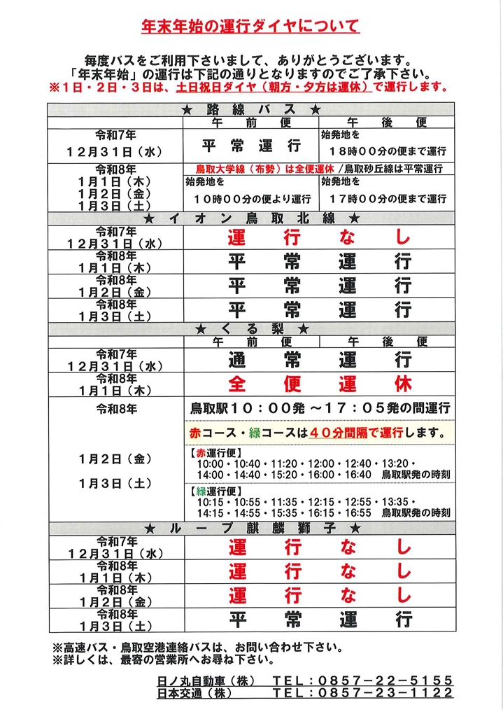 【鳥取地区】路線バス 年末年始の運行について Posted on 2025年12月10日 by 東部 年末年始 2025年12月31日(水)~2026年1月3日(土)の運行については下図の通りとなります。